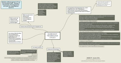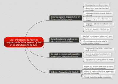 LA TECHNOLOGIE AU CYCLE 3 : Le programme d’enseignement du cycle 3 y contribue en s’organisant autour de thématiques communes qui conjuguent des questions majeures de la science et des enjeux sociétaux contemporains. Le découpage en quatre thèmes principaux s’organise autour de : (1) la structure de matière à l’échelle macroscopique, le mouvement, l’énergie et l’information - (2) le vivant, sa diversité et les fonctions qui le caractérisent - (3) les objets techniques, leur réalisation et leur fonction - (4) la planète Terre, lieu de vie.