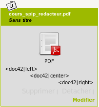 <doc42|center>ou<img41|left>) et faites un copier-coller de ce code au bon endroit dans le texte de votre article. Un lien vers ce document sera alors inséré dans votre article, avec une icône correspondant à sa nature (PDF, ODT, MP3…). Par exemple,<doc42|center>donne ici :