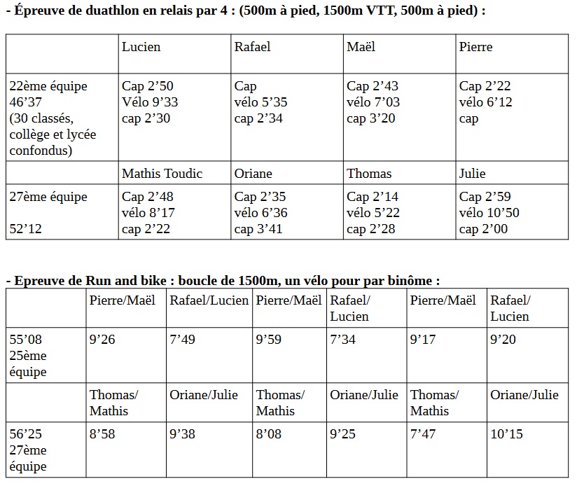 Mercredi 15 janvier 2025, 12 élèves du collège ont participé au run and bike à Cesson : Maxime Jacob 3B, Brieuc Tilly 3B, Eliaz Tilly 3A, Elouan Cornic 3A, Rafael Boulanger 5A, Pierre Manach 5A, Mael Bernard 5A, Lucien Queniat 5A, Julie Hamon 5A, Oriane Barbier 5A, Mathis Toudic 6A, Thomas Carmès 6A.