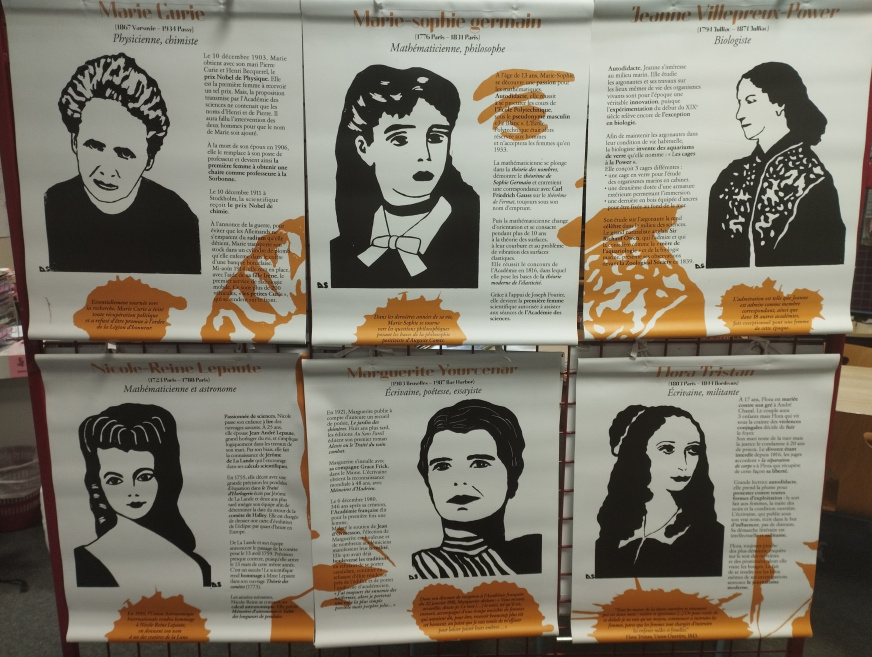 Jeudi 23 janvier 2025, l’artiste Sophie Degano est venue présenter son travail « Grâce à elles » aux élèves de 3e en cours d’Arts Plastiques, des portraits de femmes dans l’Histoire sur kakémonos actuellement en exposition au C.D.I. A travers 60 portraits, il s’est agi de mettre en lumière l’engagement de femmes en présentant des femmes qui ont investi tous les métiers depuis toujours du XIIe au XXe siècle : femmes artistes, femmes scientifiques, femmes sportives, femmes d’affaires, femmes résistantes, femmes de lettres : Alix Guy, première femme réalisatrice de films de fictions à l’époque du cinéma muet en 1896 et du premier péplum, Jeanne Bohec, résistante, Rose Valland, conservatrice de musée et résistante qui a permis la sauvegarde et la récupération des œuvres d’arts volées pendant la Seconde Guerre mondiale, Suzanne Lenglen, qui a rendu le tennis féminin professionnel, Marie de Gournay, femme de lettres qui écrivait en 1622 un livre "Egalité des hommes et des femmes" sur le droit des femmes.