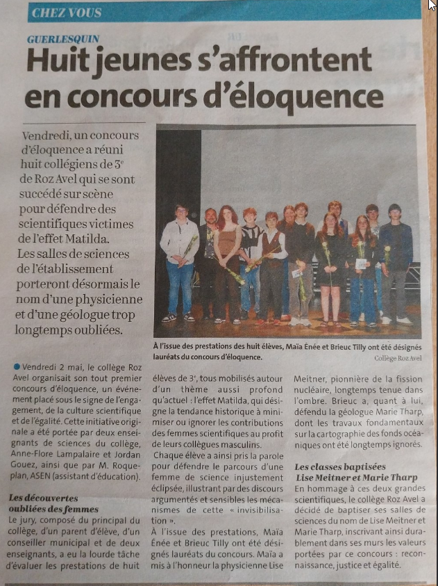 Les élèves de classe de 3e ont travaillé sur la place des femmes dans les sciences et l’effet matilda (déni ou minimisation récurrente de la contribution de femmes scientifiques à la recherche). Leurs professeurs de sciences et vie de la terre, Mme Lampalaire, de Physique-Chimie, M. Gouez et leur assistant d’éducation, M. Roqueplan leur ont proposé de participer à un concours d’éloquence. Il s’est agit pour les élèves de choisir une femme scientifique et de débattre entre eux afin de donner son nom aux toutes nouvelles salles de sciences du collège. Le résultat en image. Nous remercions Le Télégramme pour la communication de ce bel évènement. Bravo à tous !